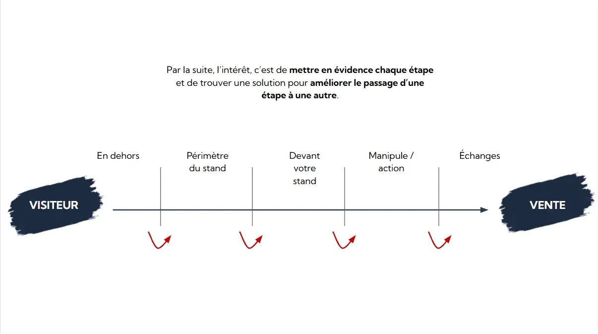 Aguicheur : personnes abordées → venues au stand. Animateur : échanges qualifiés → demandes concrètes. Vendeur : ventes / RDV pris → show-up → conversion. Un tableau simple par demi-journée suffit.