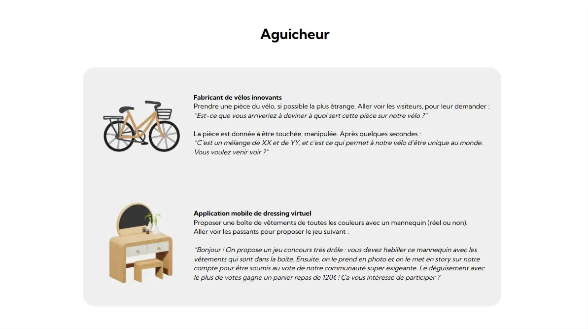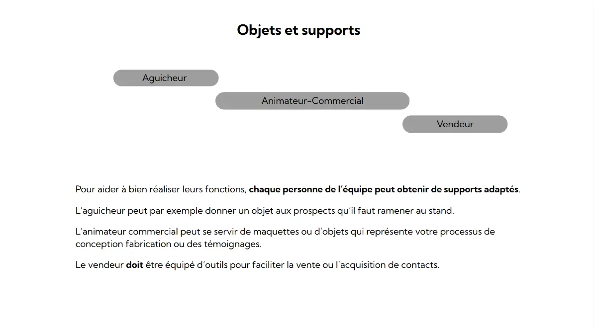Un cadre simple pour briefer et aligner une petite équipe sur un salon : l’aguicheur attire, l’animateur qualifie, le vendeur conclut. Rôles clairs, scripts courts, passage fluide d’une étape à l’autre.
